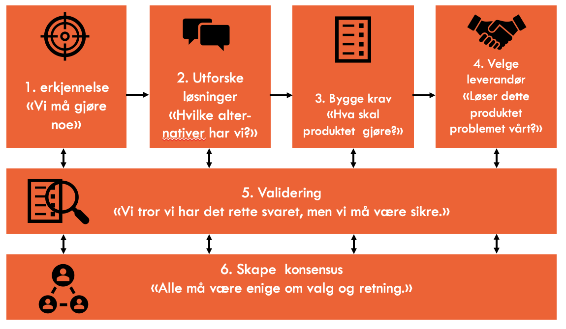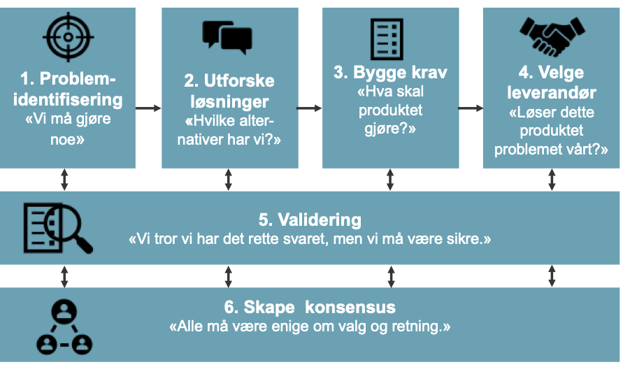 I praksis vil kjøpsprosessen være langt fra sekvensiell. Det er de to siste jobbene (Validering og Konsensus) som først og fremst forårsaker kompleksiteten og iterasjonene.