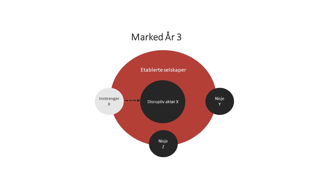 De nye disruptive leverandørene starter med å angripe de oversette/ignorerte low-end-markedssegmentene med en lavere pris enn de etablerte aktørene. De etablerte aktørene overser ofte de disruptive inntrengerne fordi markedssegmentet er lite attraktivt. Inntrengerne leverer «gode nok» produkter til lavere pris. Etter en periode beveger inntrengerne seg opp i hovedsegmentet med høyere kvalitet. Kundene i hovedsegmentet tar i bruk inntrengernes tjenester og disrupsjon er realisert. Jeg vil ikke undervurdere effekten av digital disrupsjon, men det må ikke overskygge effekten av digitalisering som etablerte leverandører gjennomfører. I mange bransjer denne effekten kunne få større konsekvenser på konkurransesituasjonen i bransjen.